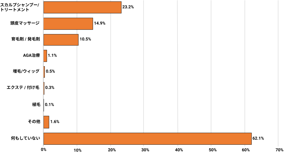 また、「普段、どのようなヘアケアを行っているか?」という質問で、最も多かったのが「スカルプシャンプー/トリートメント」、次いで「頭皮マッサージ」、「育毛剤」との回答でした。